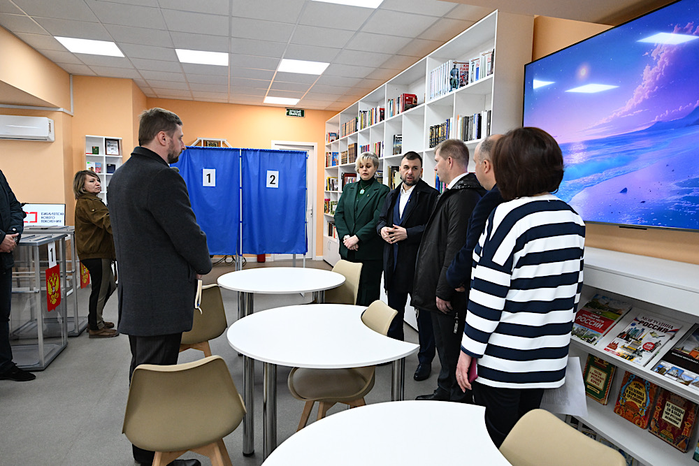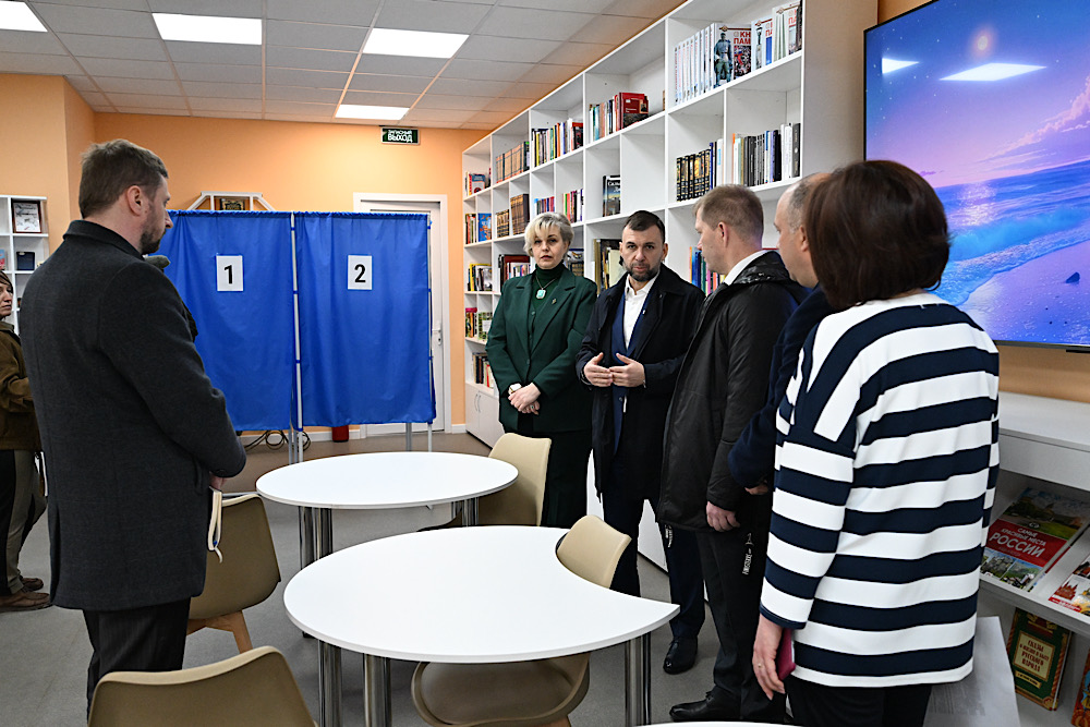 Глава Донецкой Народной Республики Денис Пушилин совместно с членом Центральной избирательной комиссии РФ Антоном Лопатиным и председателем Избирательной комиссии ДНР Владимиром Высоцким проверили готовность одного из избирательных участков в Шахтерске, расположенного на базе Центральной городской библиотеки.