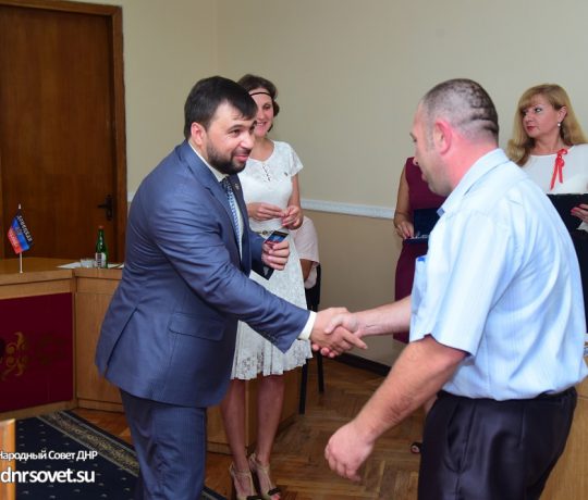 Денис Пушилин вручил членские билеты ОД «ДР» работникам шахты «Комсомолец Донбасса»
