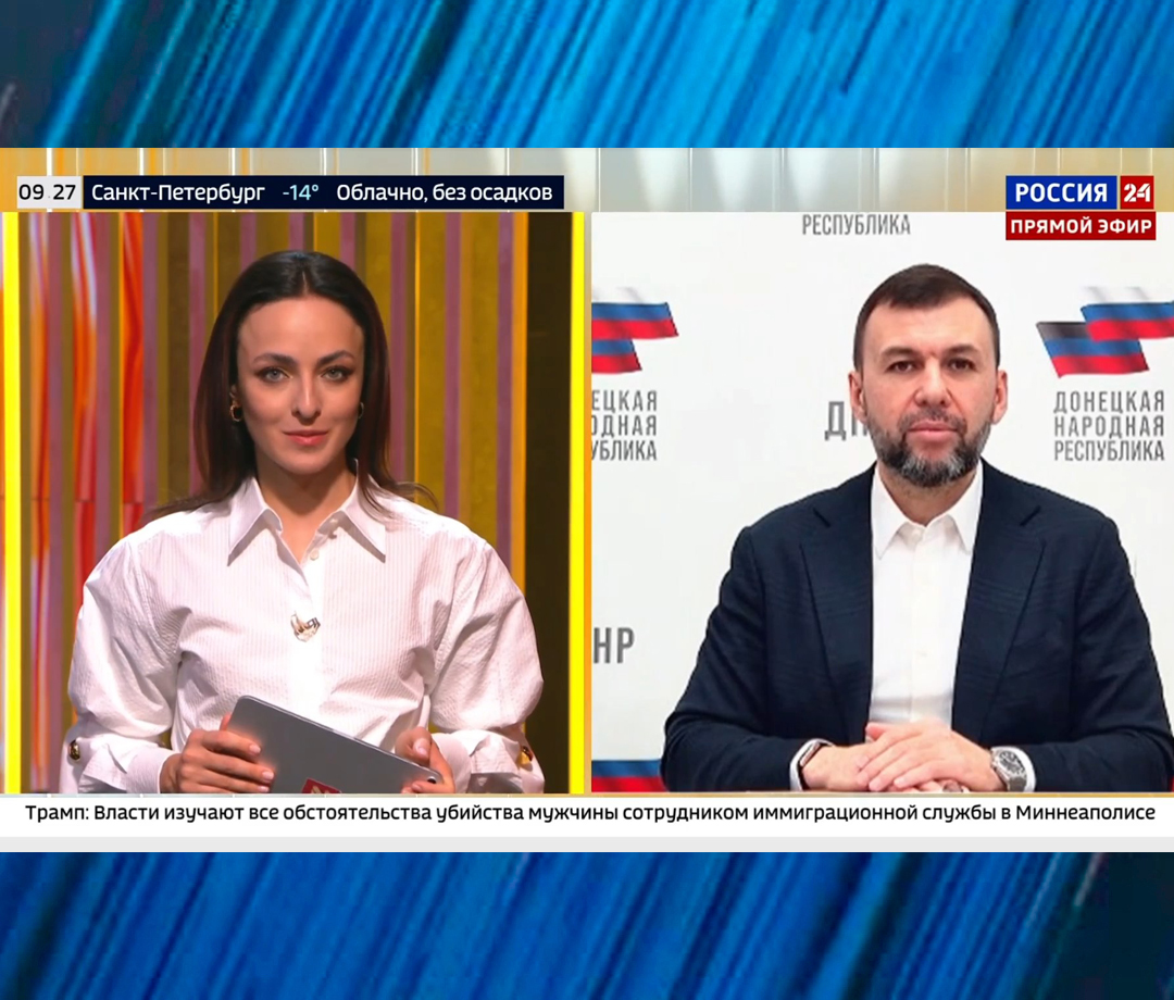 В понедельник, 26 января, Глава Донецкой Народной Республики Денис Пушилин в прямом эфире федерального канала «Россия 24» рассказал об обстановке на линии фронта, визите главы Минэнерго РФ Сергея Цивилева в Донбасс, ситуации с теплоснабжением и водоснабжением в регионе, запуске «Карты жителя ДНР», открытии новой пожарно-спасательной части в Мариуполе, а также об участии в Форуме «Знание. Государство».