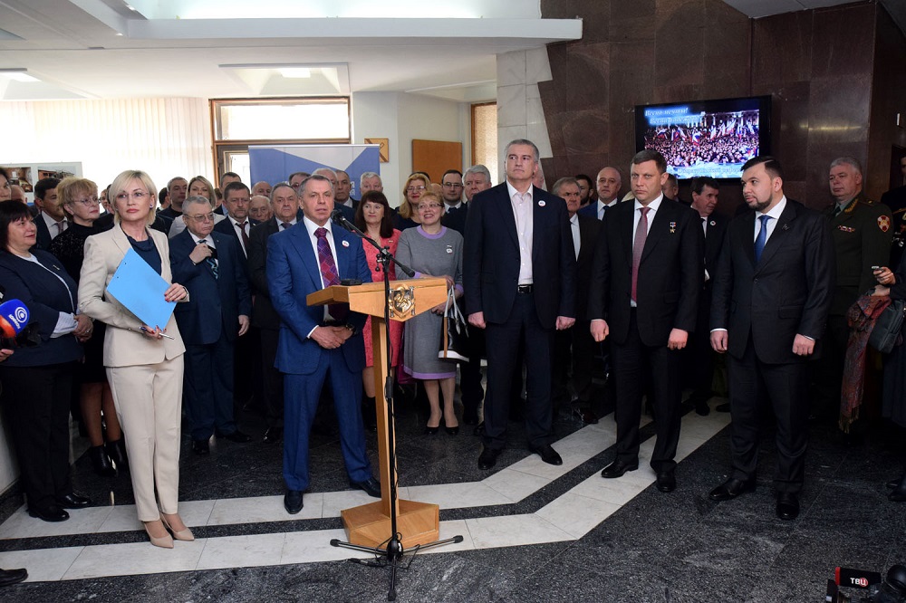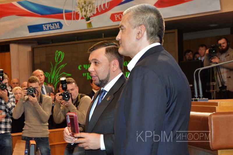 К поздравлениям присоединился Денис Пушилин. По словам спикера парламента ДНР, события в Крыму придавали сил жителям Донбасса, которые не смирились с государственным переворотом в Киеве.