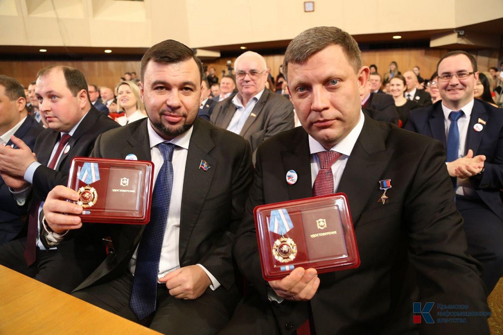 Глава ДНР Александр Захарченко вручил ордена Дружбы Главе Республики Крым Сергею Аксенову и председателю Совета министров Крыма Владимиру Константинову.