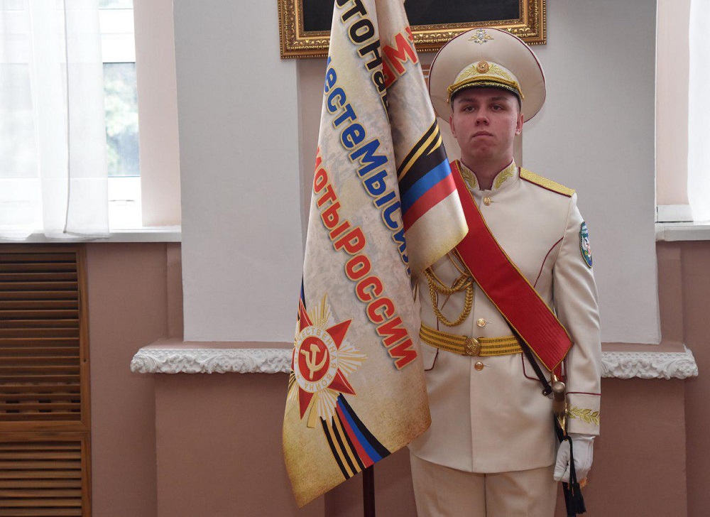 После торжественного слова главы государства учащиеся Донецкого военного лицея им. Г. Т. Берегового торжественно внесли знамя акции #ЭтоНашаПобеда, которое Глава ДНР Денис Пушилин передал руководителю общественной организации «Молодая Республика» Кириллу Макарову.