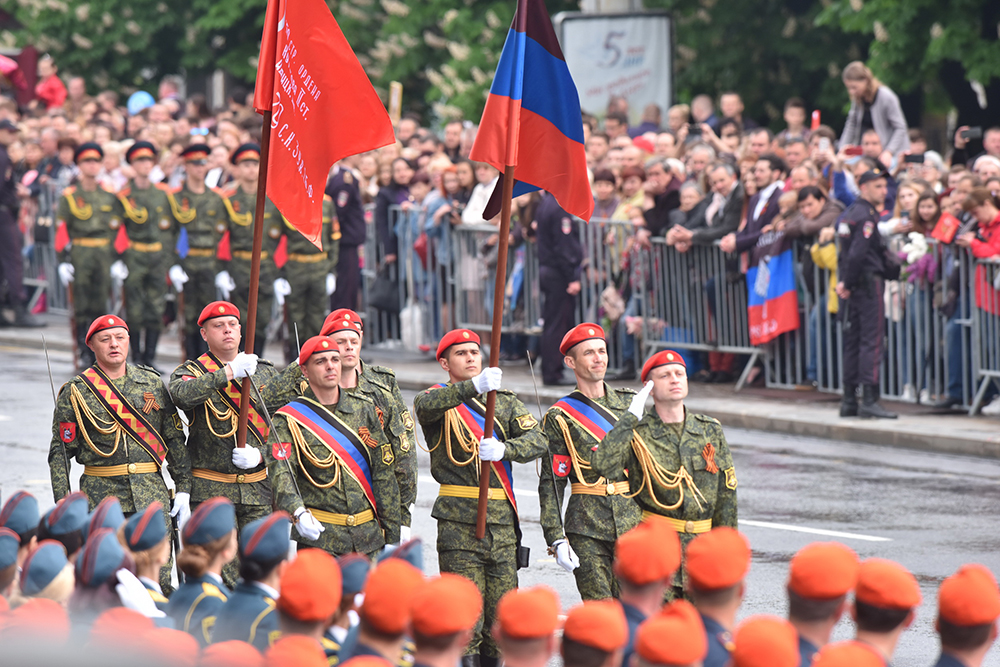 Парад открылся внесением Государственного флага Донецкой Народной Республики и копии легендарного Знамени Победы, водруженного советскими солдатами в 1945 году над поверженным рейхстагом.