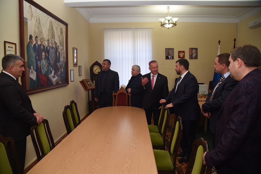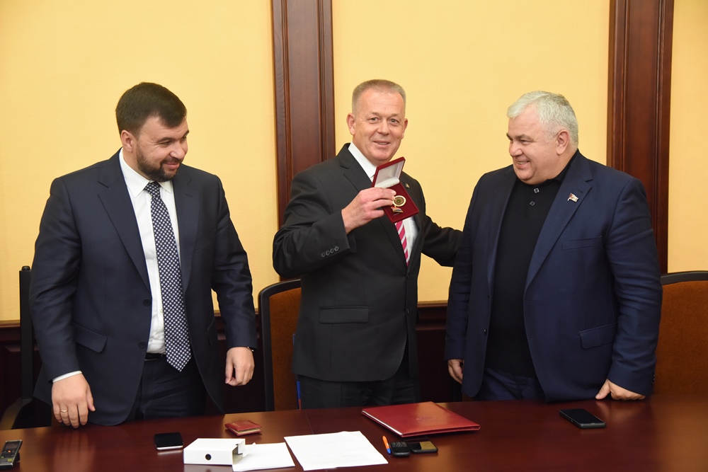 В завершение встречи и. о. ректора ДонНМУ Григорий Игнатенко присвоил звание «Почетный профессор Донецкого национального медицинского университета им. М. Горького» депутату Госдумы РФ Казбеку Тайсаеву за помощь и поддержку, которую он оказывал студентам вуза.