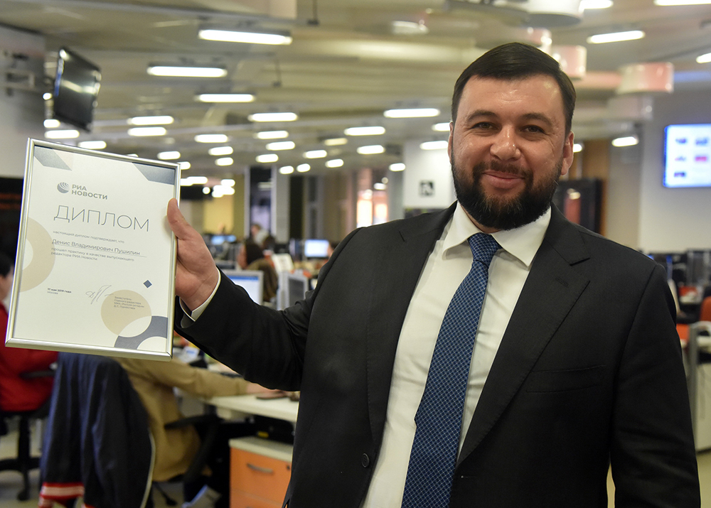 После чего Денис Пушилин был награжден дипломом от МИА «Россия сегодня», свидетельствующим о том, что он «прошел практику в качестве выпускающего РИА Новости».